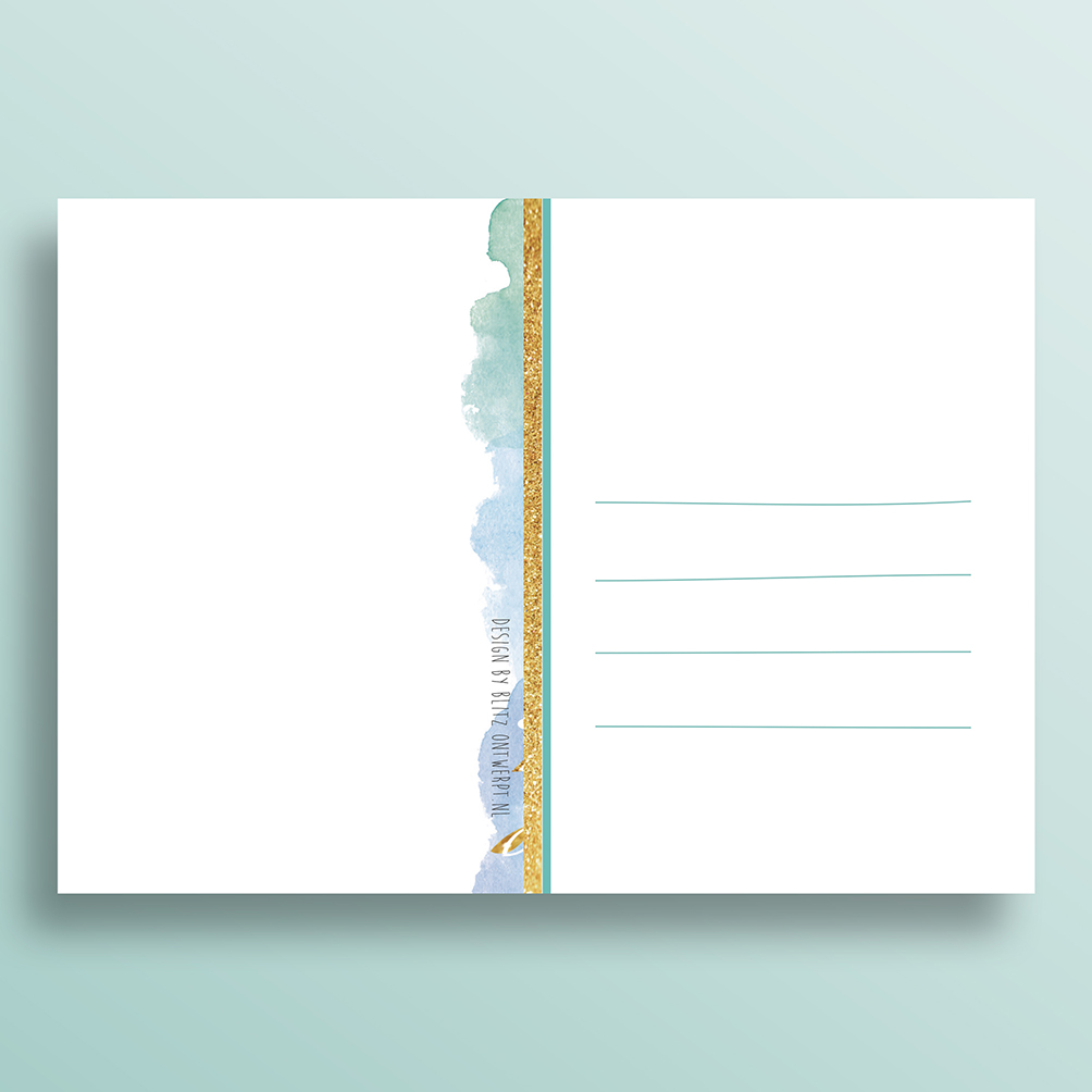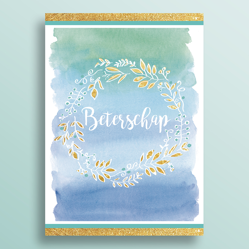 Mooie Beterschap ansichtkaart in blauwtinten, met watercolor achtergrond en gouden glitter afbeeldingen. Om te versturen naar iemand die wel wat lieve woorden kan gebruiken. Ook de achterkant is mooi ontworpen. In dezelfde categorie als Beterschap, deze Sterkte ansichtkaart.