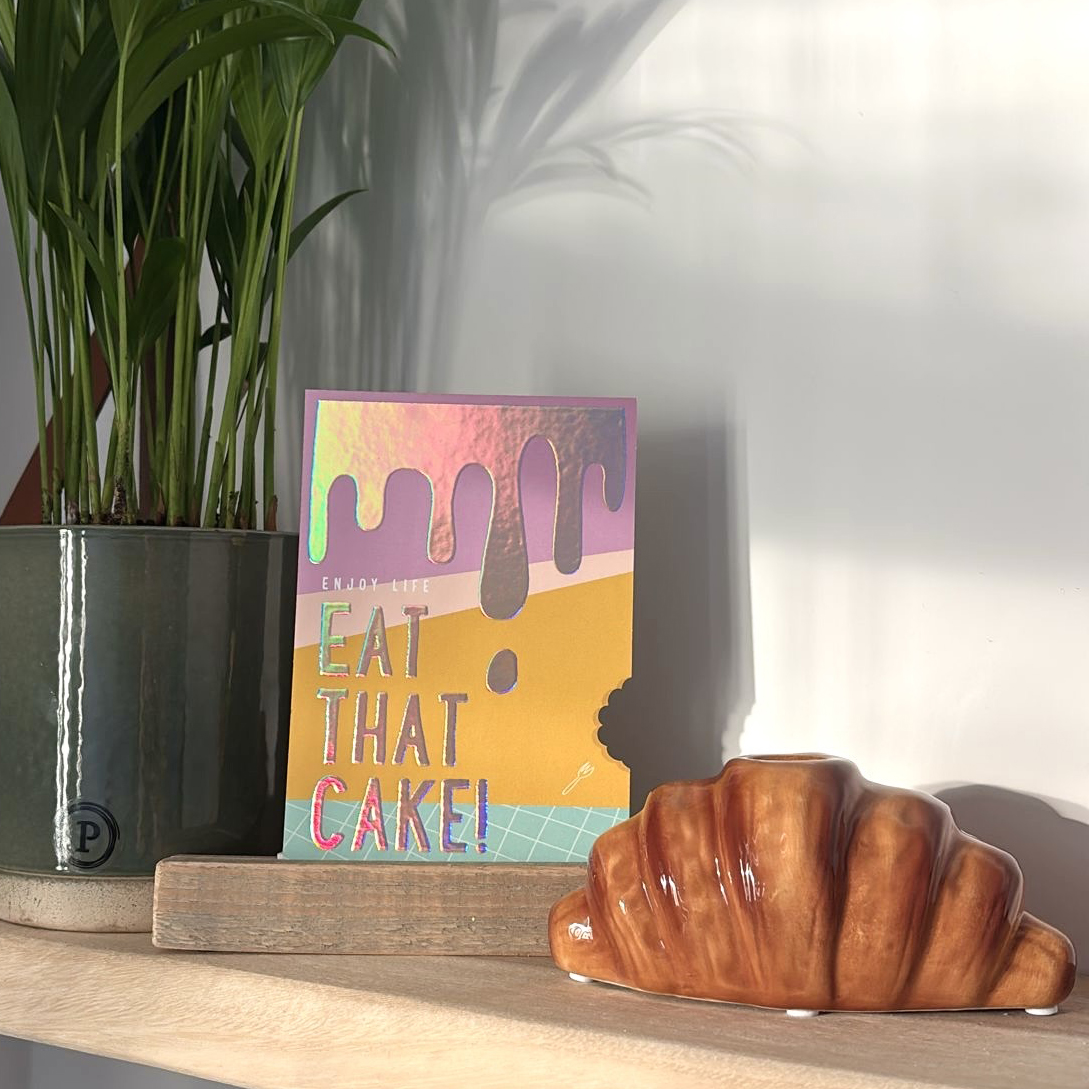 Bekend van uit het Sample boek van drukkerij PeterPrint! Deze toffe ‘Enjoy life! Eat that cake!’ ansichtkaart met holografische foliedruk én contoursnede ‘hap’ uit de taart! Door mij geïllustreerd. 11 x 15,7 cm. een mooi groot formaat voor een prachtige opvallende kaart! Heerlijk hoor die cake drip op je kaart! Een feestje om te versturen en ontvangen.